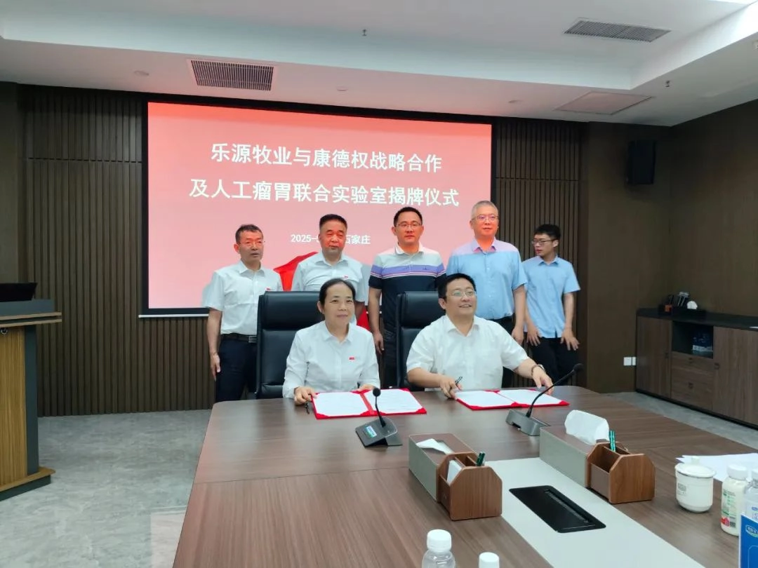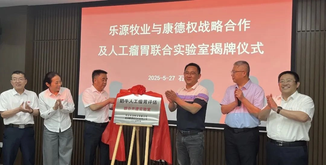 2025年5月28日,杭州康德权饲料有限公司与河北乐源牧业有限公司,在君乐宝科学营养研究院举行战略合作签约及人工瘤胃联合实验室揭牌仪式。