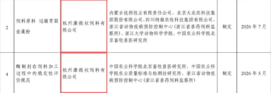 《酶制剂在饲料加工过程中的稳定性评价规范》团体标准由杭州康德权饲料有限公司牵头起草,中国农业科学院北京畜牧兽医研究所、中国农业科学院农业质量标准与检测技研究所、浙江省动物疫病预防控制中心(浙江省兽药饲料监察所)等共同参与制定。