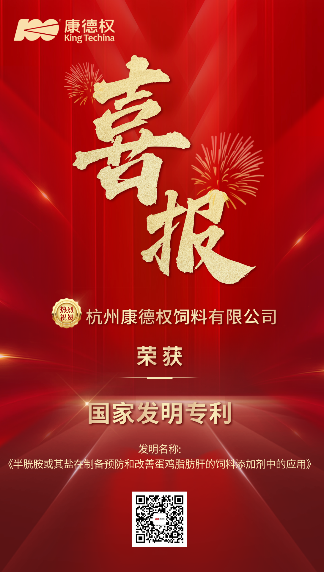 喜报丨杭州康德权饲料有限公司《半胱胺或其盐在制备预防和改善蛋鸡脂肪肝的饲料添加剂中的应用》荣获国家发明专利!